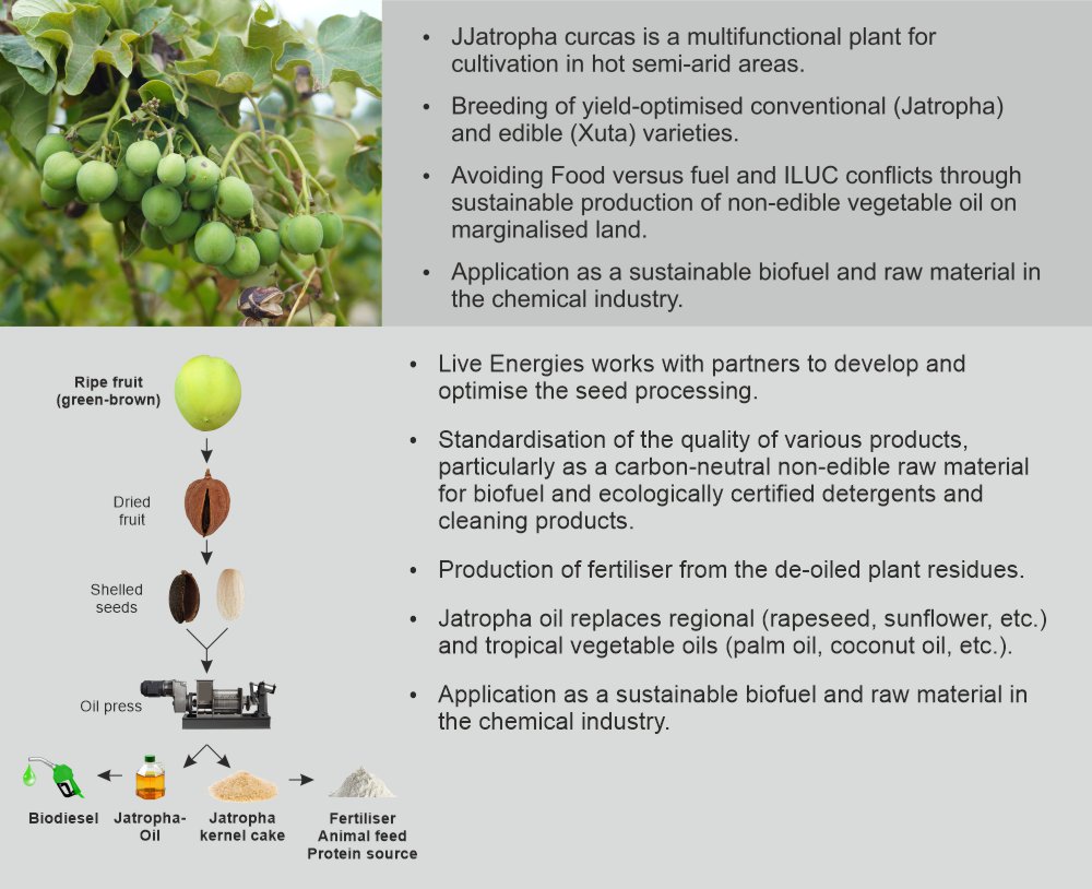 Live Energies works closely with Jatropower AG in developing high-performance edible and conventional Jatropha seeds and associated agronomic technologies. With yields four times higher than wild seed, Jatropha oil is free from “food vs fuel” controversies and ILUC (Indirect Land Use Change) conflicts and is intended for use as a CO₂-neutral raw material in ecologically certified washing and cleaning products.