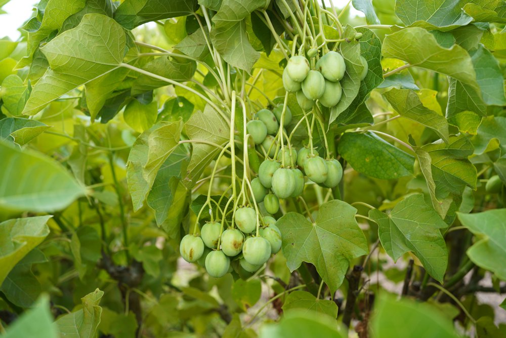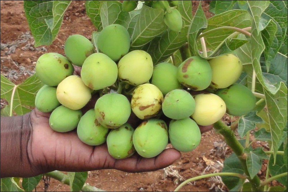Jatropha curcas (Purgiernuss) ist ein Strauch oder ein kleiner Baum, der zur Familie der Euphorbiaceae gehört. Er ist in den tropischen Regionen Afrikas, Asiens und Lateinamerikas weit verbreitet. Seine Samen haben einen extrahierbaren Ölgehalt von etwa 35 %.
